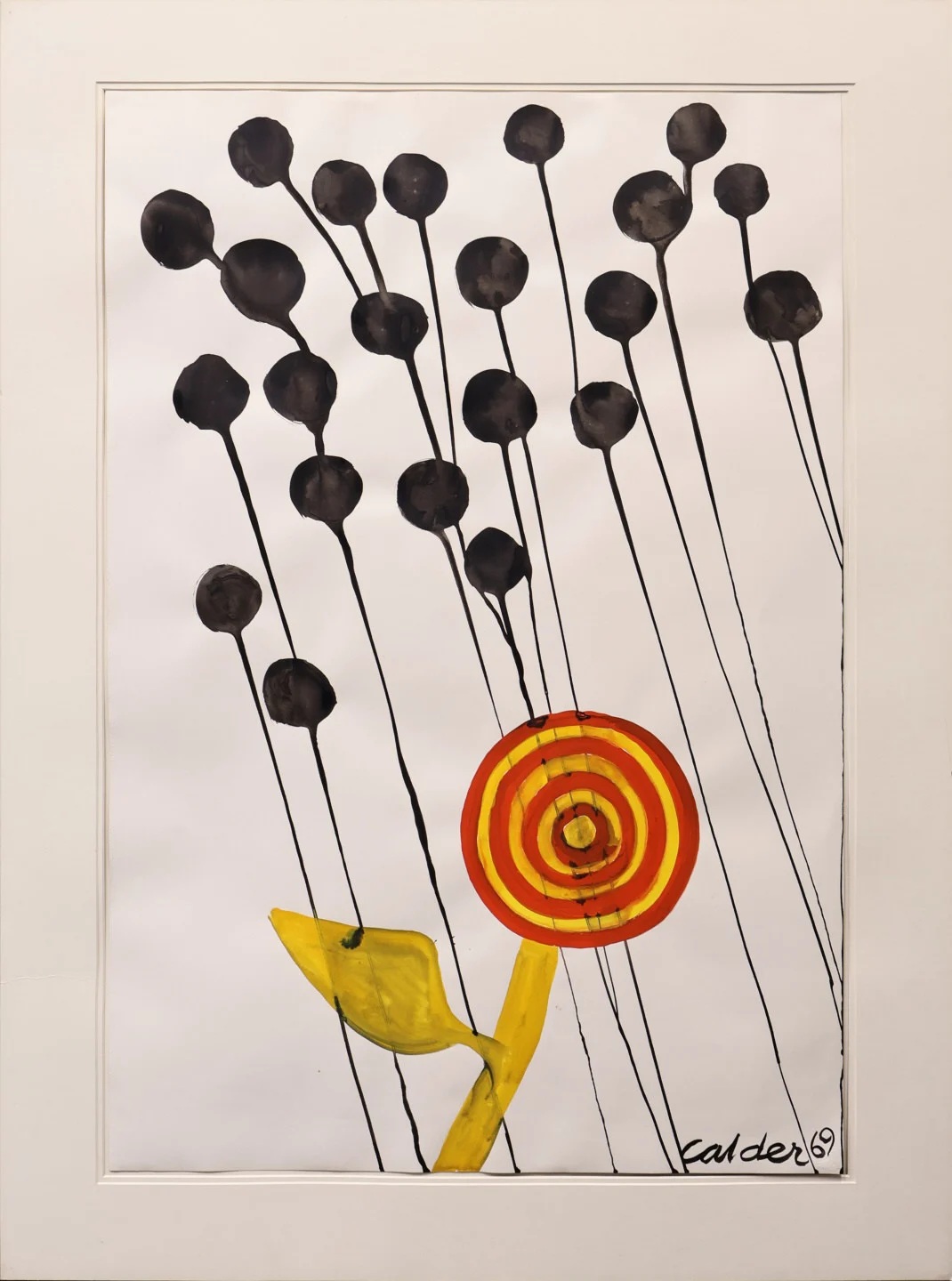 This compelling work exemplifies Calder’s distinctive visual language. Target Flower presents a bold, graphic composition- its “flower’ formed by concentric rings of yellow and red. Grounded by expressive black ink elements that extend diagonally toward the lower edge. The piece reflects Calder’s masterful interplay of spontaneity and structure, hallmarks that defined his enduring contribution to 20th-century art.